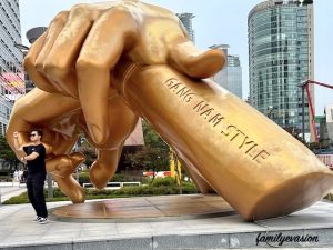 Gangnam en a fait une statue honorifique pour son chanteur fétiche. La foule se précipite pour décrocher la photo ou selfie à ramener in the pocket sur les airs de la célèbre chanson.