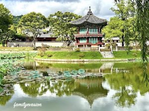À l’intérieur du palais, dans la cour principale, le pavillon Geunjeongjeon, où les rois recevaient leurs ministres, impressionne par son reflet dans l’eau, comme suspendu, lui aussi, hors du temps.
